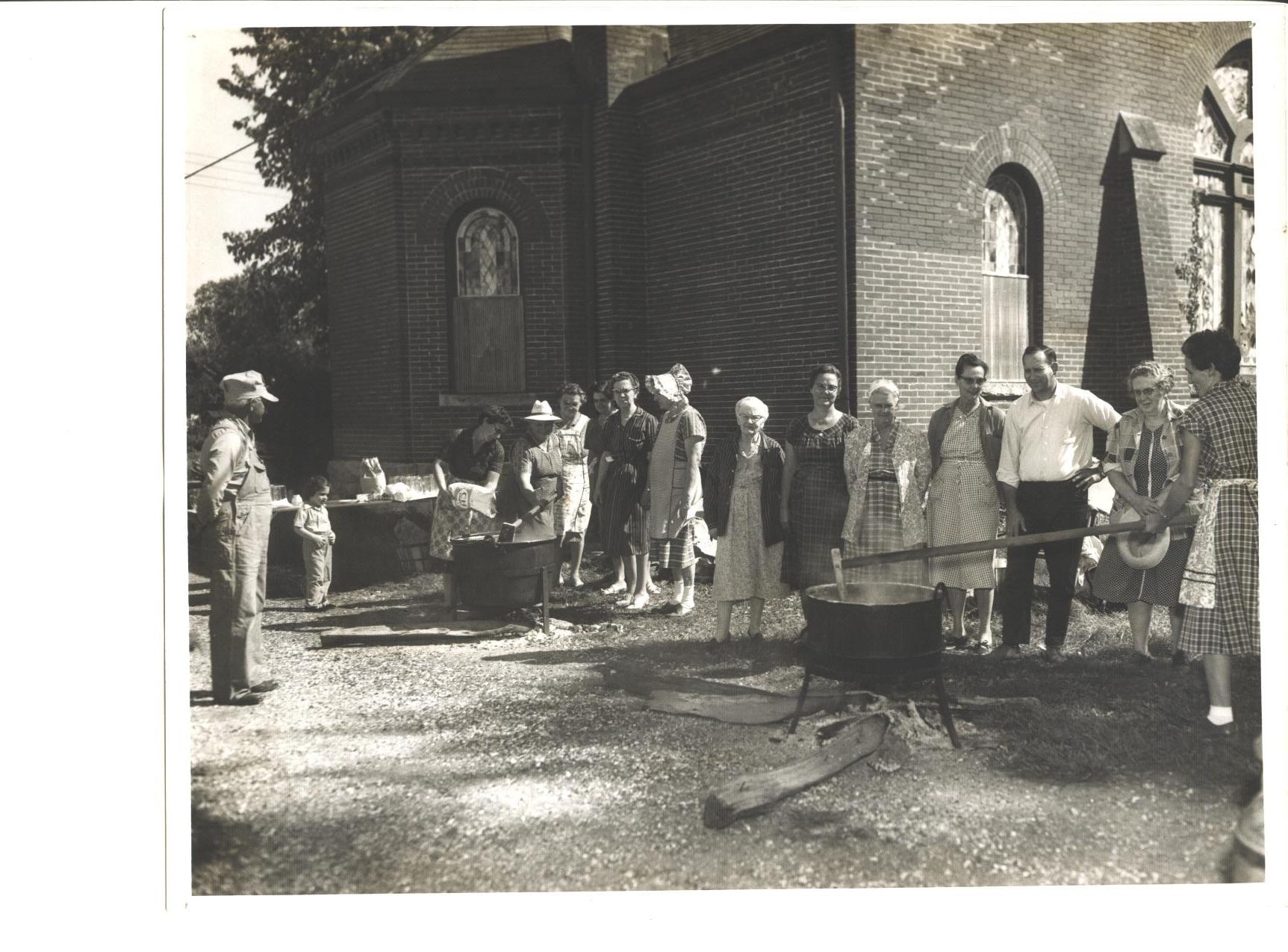 Over the years many traditions have come and gone (ice cream socials, auctions, etc.) and others have survived (Easter sunrise service, fellowship dinners) and new ones have been started (Valentine dinner, garage sale). One church tradition, started around 1960 (the exact year is still hotly debated) has endured, the making of apple butter. This tradition was started by two families, the Wehmeyers and the Calvins. The Wehmeyers made the apple butter and Robert Calvin loved to eat it. Every year the church had an auction and the Wehmeyers would donate a few jars of their homemade apple butter. The apple butter recipe came with their family when they came to America from Germany. It is made in large copper kettles, stirred constantly with large paddles and hand dipped into jars at the end of the day. Mr. Calvin complained that there was not enough apple butter to go around (and the price was too high) and suggested the church make its own as a fundraising project. The Wehmeyers loaned the church a kettle and the expertise and the tradition was begun. It has grown to four kettles and there is still not enough to go around. Apple butter day begins around 3:30 or 4:00 in the morning and if everything goes well, the apple butter is ready to jar by 3:00 or 4:00 that afternoon. Two of the Wehmeyer sisters (Vernetta & Berdina) still run the show with the help of family and church members.